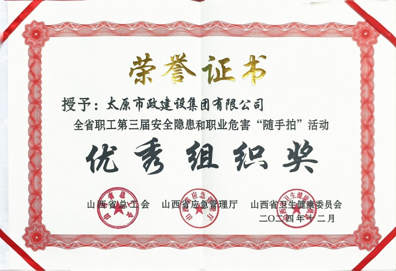 太原市政集團(tuán)被山西省總工會(huì)、山西省應(yīng)急廳、山西省衛(wèi)生健康委員會(huì)授予全省職工第三屆安全隱患和職業(yè)危害“隨手拍”活動(dòng)優(yōu)秀組織獎(jiǎng),其中三名職工的“隨手拍”作品獲得優(yōu)秀獎(jiǎng)。