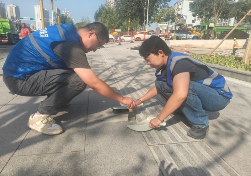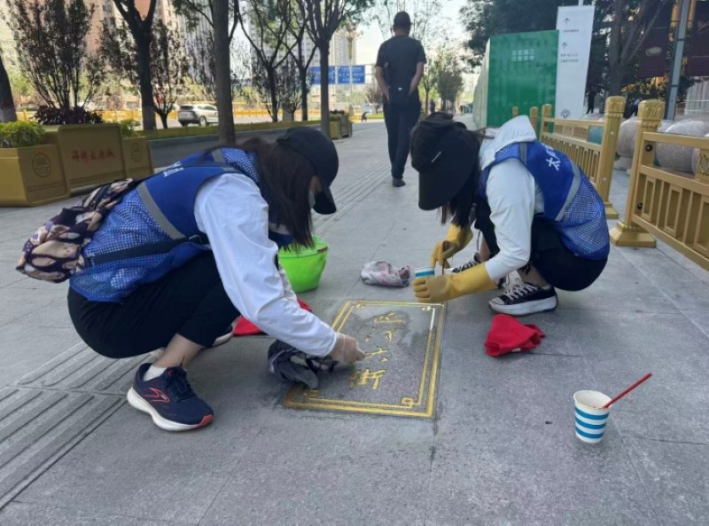 活動自9月4日起為期六天,覆蓋迎澤大街(西段)全線,重點圍繞附屬設(shè)施清潔與道路精細化維護展開?;顒又校碇y(tǒng)一藍色“太原市政集團”馬甲的志愿者們,手持長柄擦洗器、水桶、抹布、鏟刀、掃帚等工具,對道路兩側(cè)公交站臺、路燈基地、護欄、照明燈桿等設(shè)施進行系統(tǒng)清理與擦洗;同步推進地磚灌縫精細化維護作業(yè),通過專業(yè)操作,確保每一條裂縫都“嚴絲合縫”,有效提升路面耐用性與通行舒適度,以實際行動為市民出行安全與舒適保駕護航;同時,志愿者專門對道路沿線的石頭字景觀展開描金作業(yè),細刷蘸取金色涂料,一筆一畫精心描摹,成為主干道上一道兼具文化氣息與視覺美感的獨特風(fēng)景。